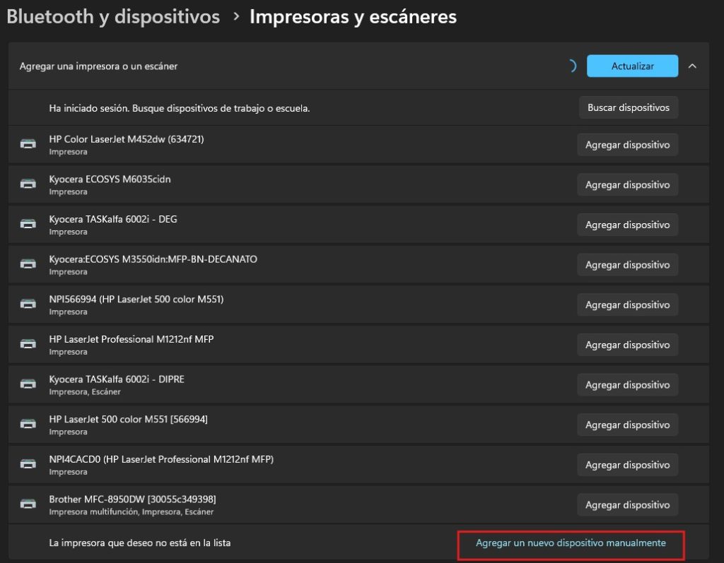 3. Hacer clic en “La impresora que quiero no está en la lista” > “Agregar dispositivo manualmente”